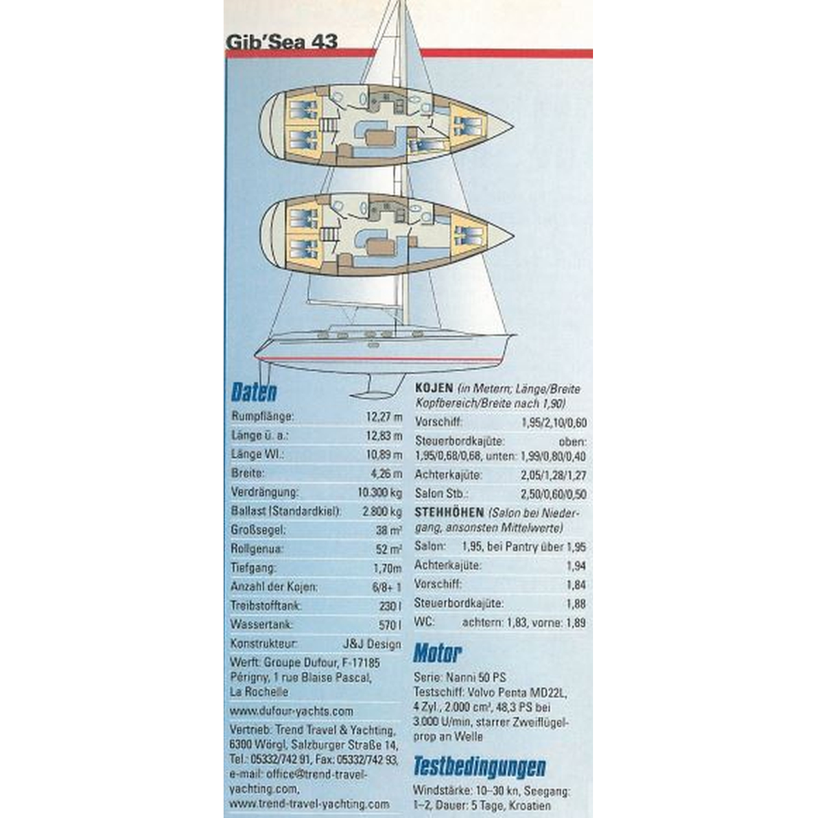 Die von Dufour gebaute Gib Sea 43 ist eine nicht nur optisch außergewöhnliche sondern auch schnelle und zuverlässige Yacht. Dies bestätigen verschiedene Charteragenturen sowie der Chefredakteur eines großen europäischen Yachtmagazines, der selbst die Yacht getestet hat: