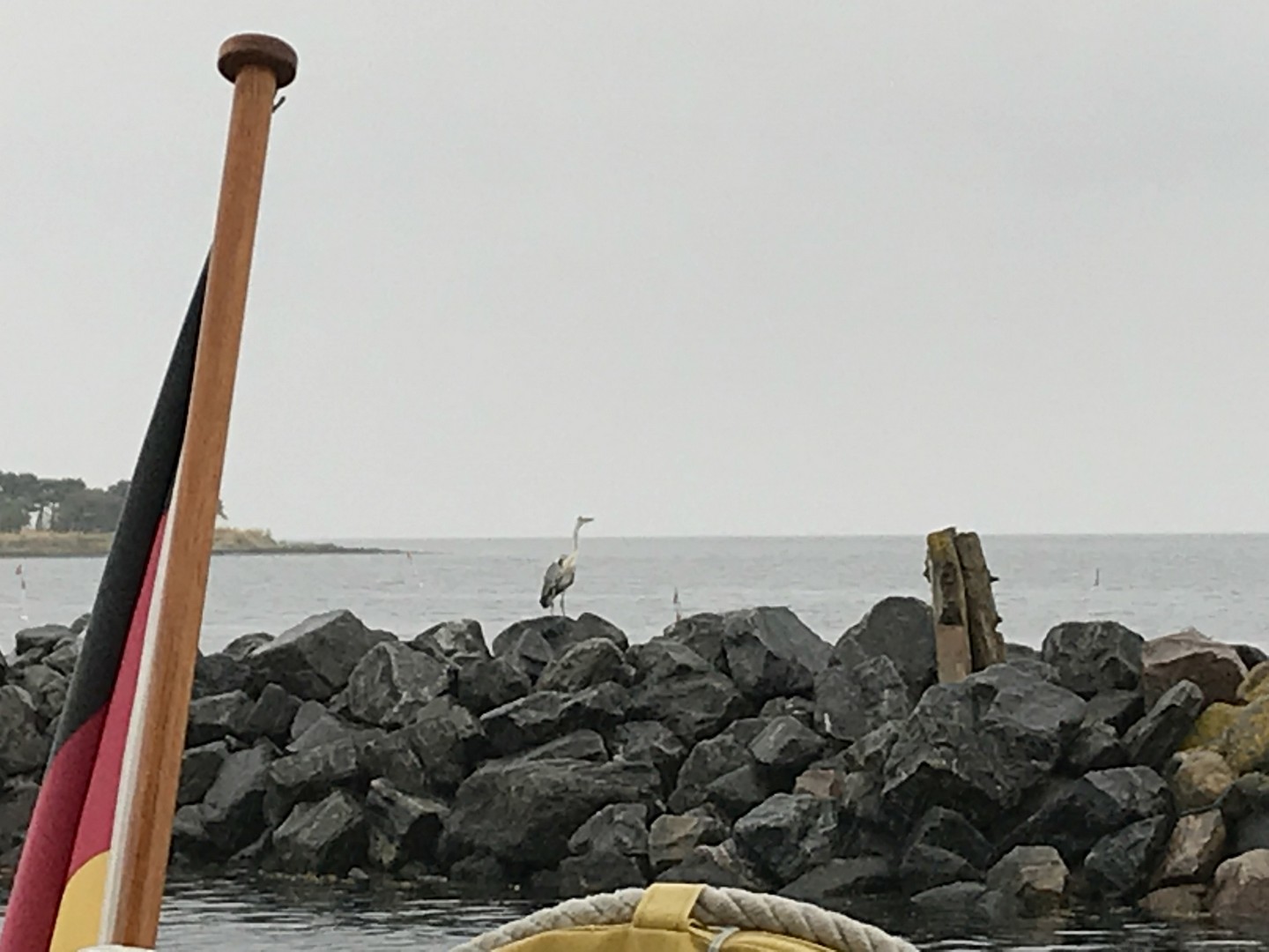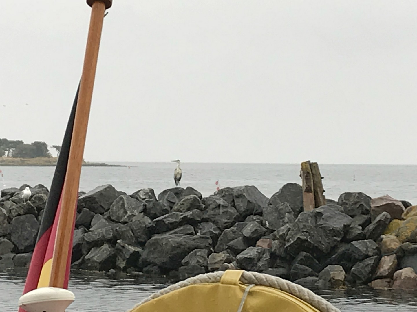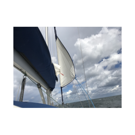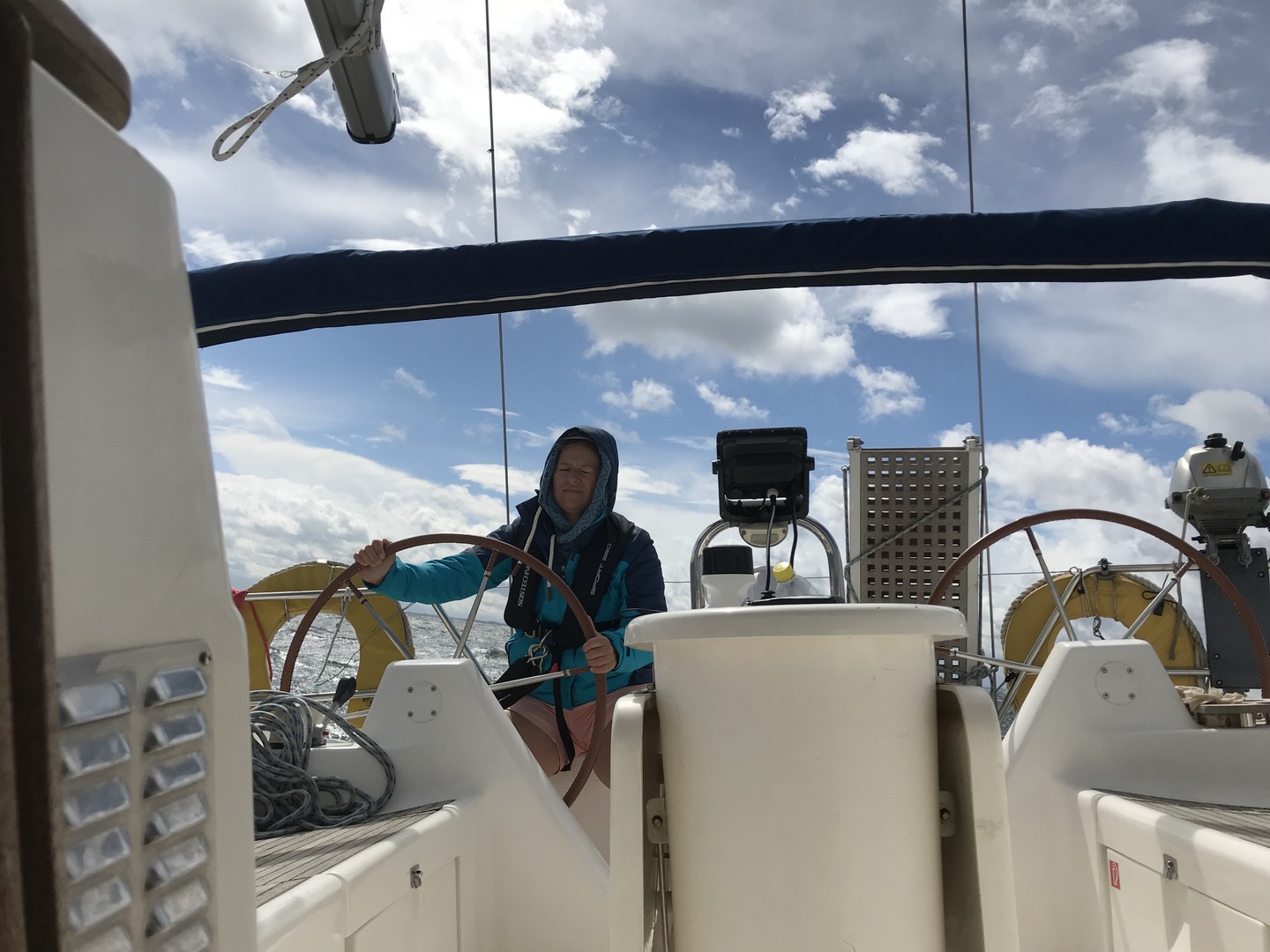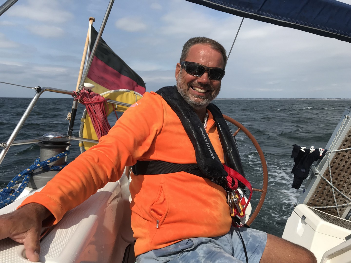 Dann kam ein Funkspruch: "Mayday -Mann über Bord". Eine Seglerin, die sich mit ihrem Mann nördlich von Kiel Leuchtturm befand, funkte "Mayday", da ihr Mann über Bord gegangen war. Schon kam der Funkspruch des Seenotrettungskreuzers „Berlin“: „Alle Seefunkstellen sind aufgefordert zu helfen.“ Ich schaute Anja an und sagte ihr, dass wir jetzt da hoch müssten. Die “Berlin“ fuhr nur wenige 100 Meter an uns vorbei und wir nahmen Fahrt nach Kiel Leuchtturm auf, nachdem ich die Plicht einigermaßen klarieren konnte. Somit hat sich die Entscheidung Schilksee anzulaufen erledigt. Bis dahin hatte ich die Genua auf circa fünf Quadratmeter gerefft. Nach einer halben Stunde kam dann die Meldung, der Ehemann konnte wieder selbstständig an Bord klettern und die lebensbedrohliche Situation auf dem Schiff war beendet.