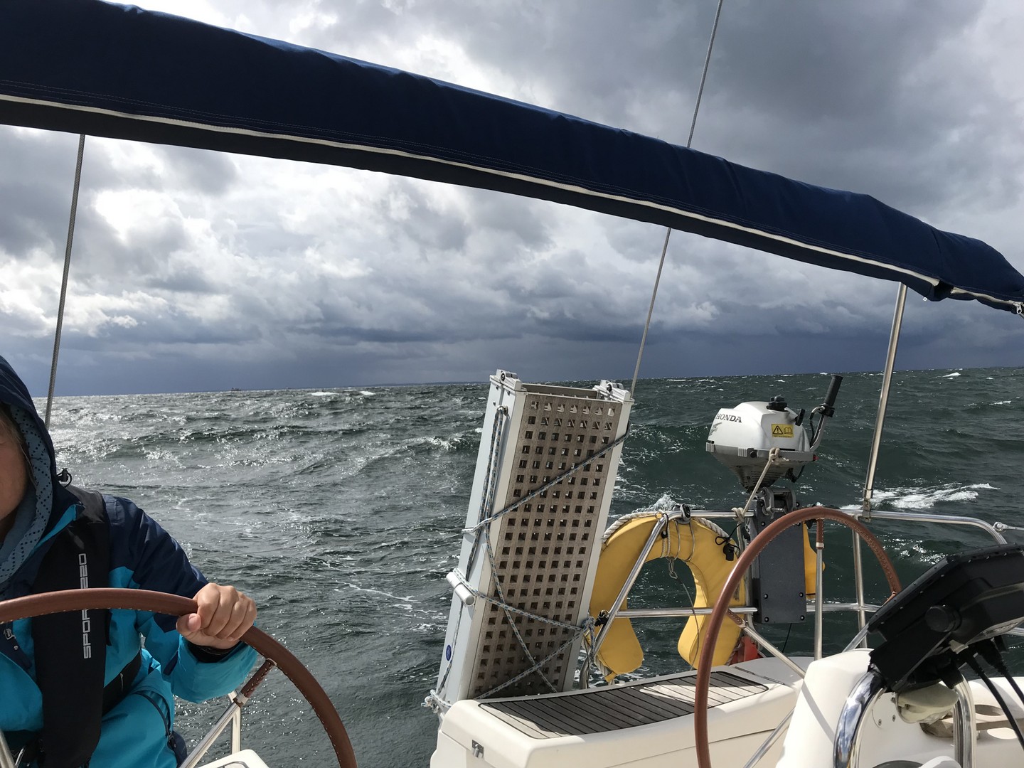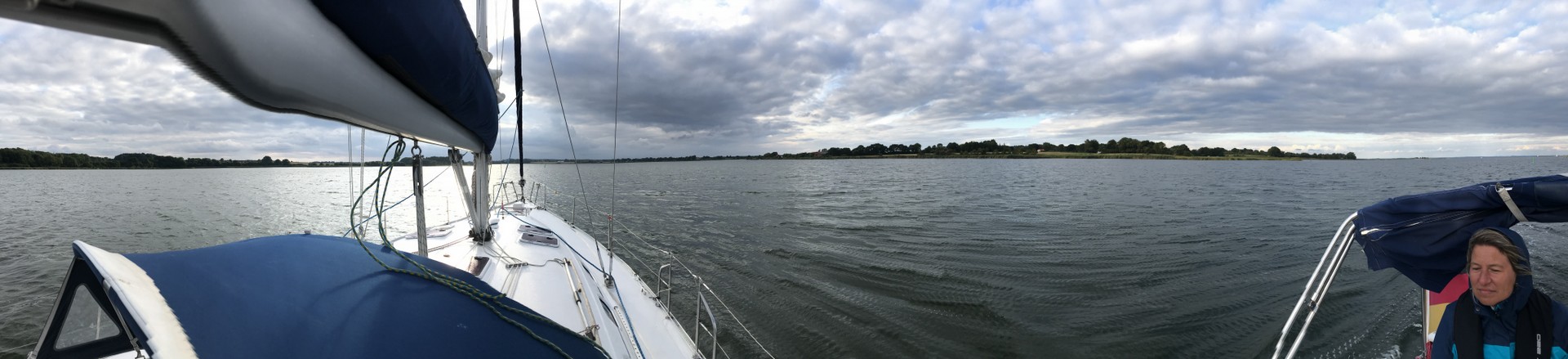 Es waren ungefähr so 5-6 Windstärken, als wir ausliefen. Gegen 11:00 Uhr, wir hatten gerade Laboe querab passiert, kam aus Süd/West eine Wolkenfront, die nichts Gutes verheißen ließ. Ich hatte vorsorglich nur die Genua gesetzt, weil die Wind vorhersage keine Kaffeefahrt versprach. Dann ging es auch schon los: die Gewitterfront erreichte uns wenig später und ich versuchte die sowieso schon gereffte Genua weiter über die Winschen einzuholen. Anja stand kreidebleich im Niedergang. Dann drückte eine Bö das Schiff auf die Seite, so dass das Freibord unter Wasser war und ich überlegte, Schilksee anzulaufen.