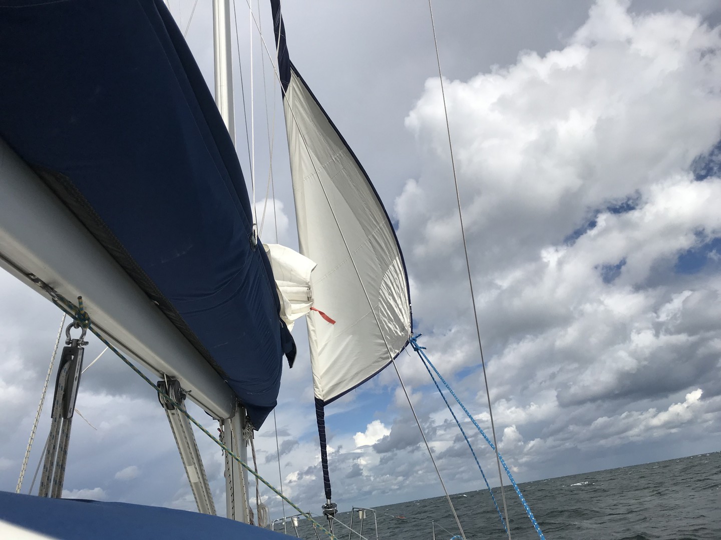 Wenige Stunden später, vor der Einfahrt nach Marstal, es war so circa 16:00 Uhr, kamen dann weitere stürmische Böen auf uns zu. Mittlerweile hatte ich die Genua nur noch 2 m ausgerollt und wir machten trotzdem sieben Knoten Fahrt über Grund. Ursprünglich waren wir an dem Abend in Marstal mit mehreren Segelcrews verabredet, doch wenige haben sich wirklich auf den Weg nach Marstal gemacht. Ein Bekannter, der dieses Treffen organisiert hatte, meinte, wir sollten doch nach Bagenkop abdrehen. Dies war allerdings völlig unpassend in Anbetracht der Wetterverhältnisse. Ich sah, dass sich ein extremer Schwell aufgebaut hatte, der dort aus West brutal in den Hafen rollte.