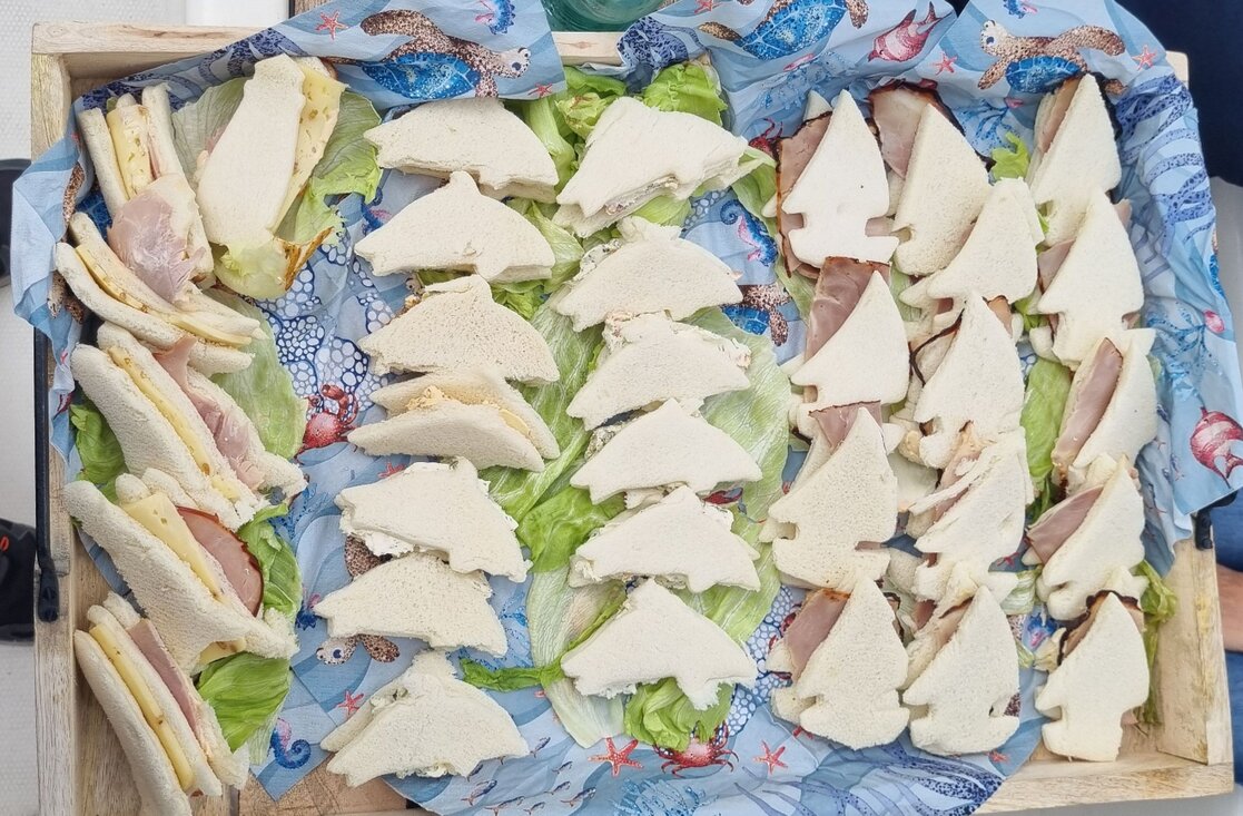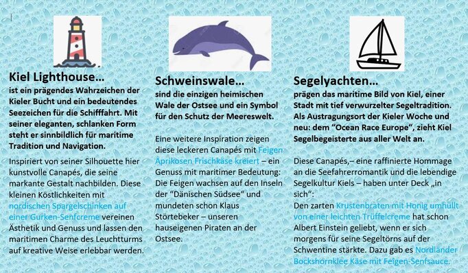 Cateringbeispiel: Kleingruppen bis ca. 10 Personen:Paket “Nordisch Kiel“ Canapés zu Themen rund um die Kieler Bucht:Ca.10x6cm in maritimer Form geteilt und angerichtet) belegt z.B. mit:z.B. Holsteiner Katenschinken, Frischkäse mit Feigen der Dänischen Südsee u.a. - Garniert mit Seemannsgarn:Hier ein Vorgeschmack. Ein Firmenevent mit 40 Teilnehmern auf 4 Hochsee Yachten: