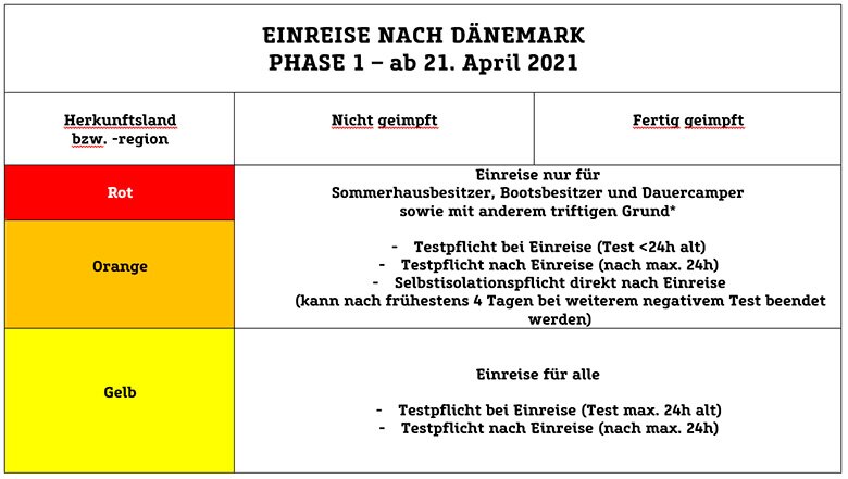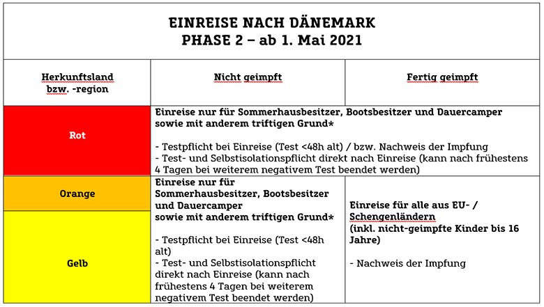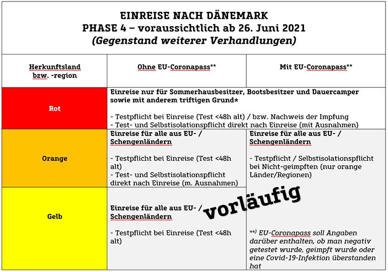 PHASE 4 – ab 26. Juni 2021*: Einführung eines europaweiten Coronapasses. Einreise nach Dänemark möglich, allerdings muss man entweder geimpft oder negativ getestet sein. Einreisen aus orangenen Ländern / Regionen unterliegen voraussichtlich weiterhin einer Testpflicht. Weitere Details stehen noch nicht fest.