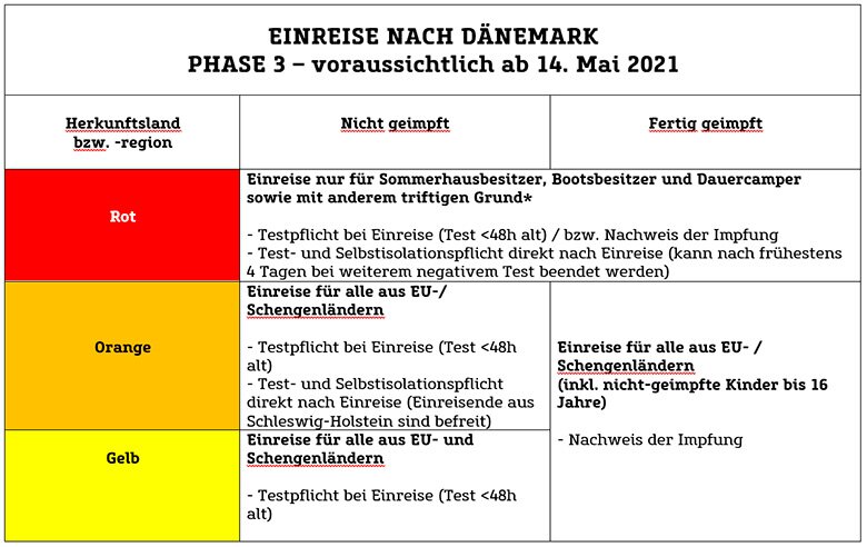PHASE 3 – ab 14. Mai 2021*: Lockerung der Inzidenzwerte. Einreise aus orangefarbenen EU- und Schengen-Ländern und -regionen jetzt ohne triftigen Grund möglich, allerdings besteht weiterhin Test- und Selbstisolationspflicht für nicht-Geimpfte. Einreisende aus der Grenzlandregion Schleswig-Holstein müssen nicht mehr in Selbstisolation.